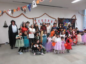 当日は、ハロウィンの仮装をした子供たち30人が、会場に来てくれました!山形県内各地のALTをはじめ、海外出身の9人のスタッフと一緒に、子供たちは英語のゲームやフェイスペインティング、おばけの塗り絵など、様々なアクティビティを楽しみました。子供たちは、おいしいカボチャのケーキなど、たくさんお菓子のお土産を持ち帰りました!参加者の皆様からは、先生方の温かな雰囲気のおかげで、子供たちが楽しく英語でお話しできる機会になったと、ご好評をいただきました。