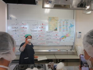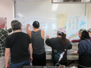 芋煮が煮える間には、日本語教室の先生方による、方言についての講座が開かれました。山形の内陸と庄内の方言の違い、さらに関西弁といった、色々な方言が紹介されました。そのあとには生徒さんたち自身が、今回学んだ山形弁を、教室で勉強してきた標準語に言い換える問題に挑戦。山形独特の方言の表現に、生徒さんたちは興味津々の様子でした!
