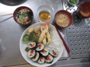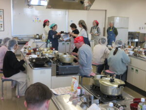 令和7年12月6日、霞城セントラル4階ヘルシークッキングルームにて、日本食の食文化体験イベント「日本のおもてなし料理『巻き寿司・天ぷら・吸い物・味噌汁』の体験」が開催されました。ボランティア講師の皆さまの指導のもと、27名の海外出身者が、日本食4品の調理に挑戦しました。